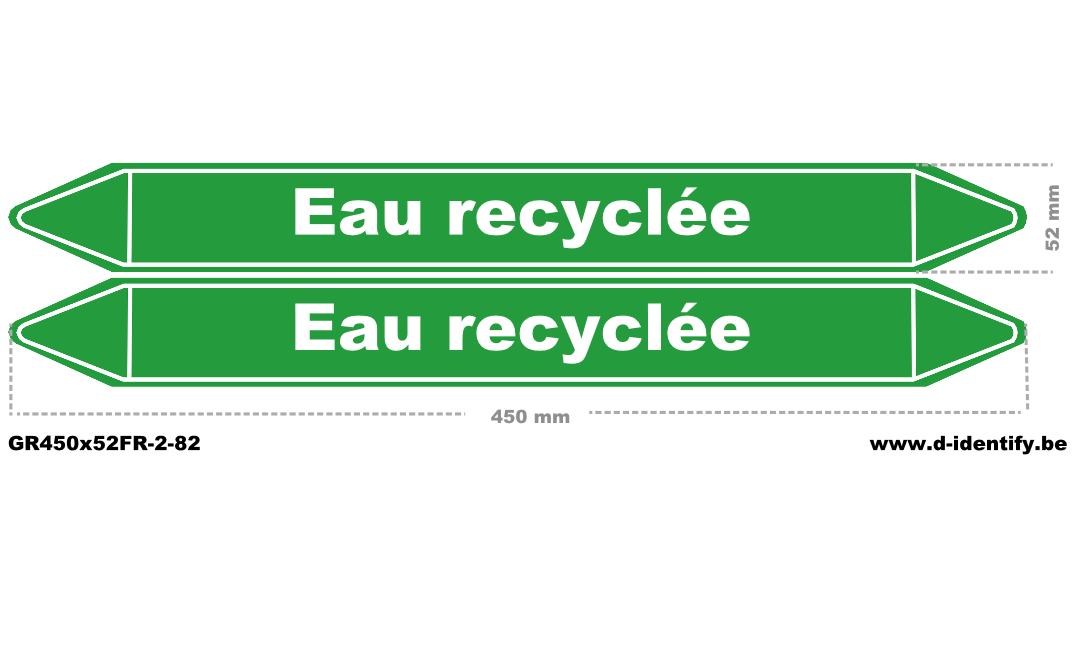 Marquage de tuyauterie eau recyclée conforme NBN T 69-004 avec flèches directionnelles. Formats adaptés aux diamètres standards.